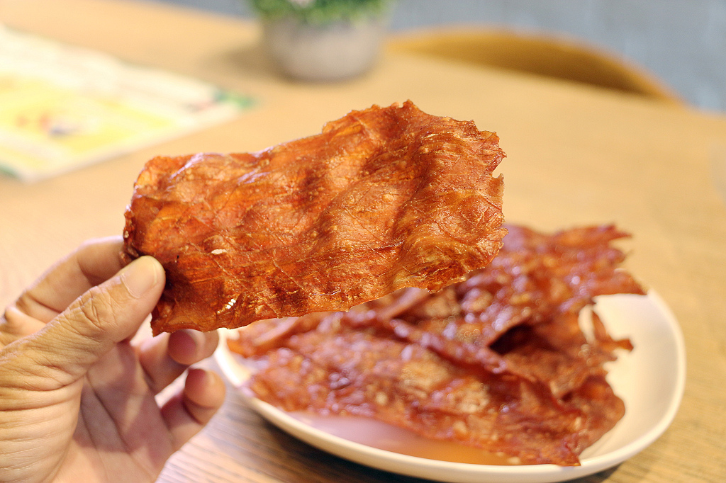 北斗三大名產:肉圓、肉餅與肉乾,北斗肉乾在製作方式上,特色獨具屬薄片肉乾,豬肉 (後腿小里肌肉去筋去油) 切成薄片後,需低溫冷凍 12小時以上,解凍後放置於竹篩上進行天然日曬後,再次低溫冷凍 72小時,最後用慢火烘烤製作,薄薄的一片,味道甜中帶鹹,兼具香、酥、脆三種口感,仔細看肉乾表面,可以看到日曬時竹篩壓痕。(照片:李老城肉脯店 (錦香園) / 肉乾)