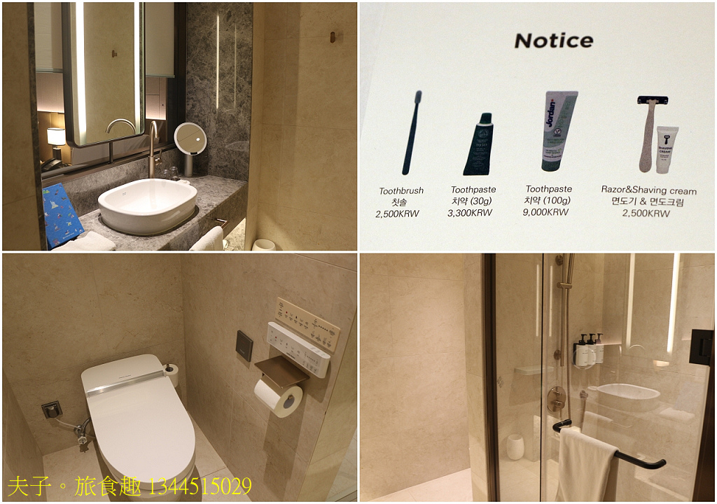 乾溼分離衛浴配置免治馬桶,提供吹風機、化妝鏡,淋浴間配合世界環保議題,僅提供大瓶裝沐浴精、洗髮精與潤髮乳,且不提供一次性備品 (牙刷、牙膏、刮鬍刀),若有需要可單項購買 (台幣:韓幣 = 1 : 44)。