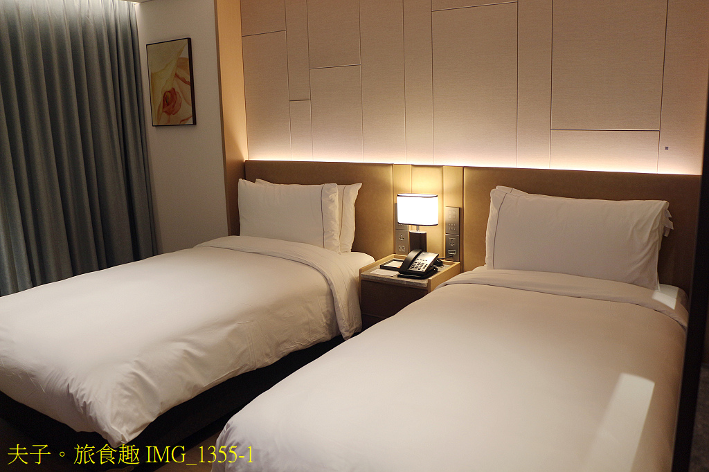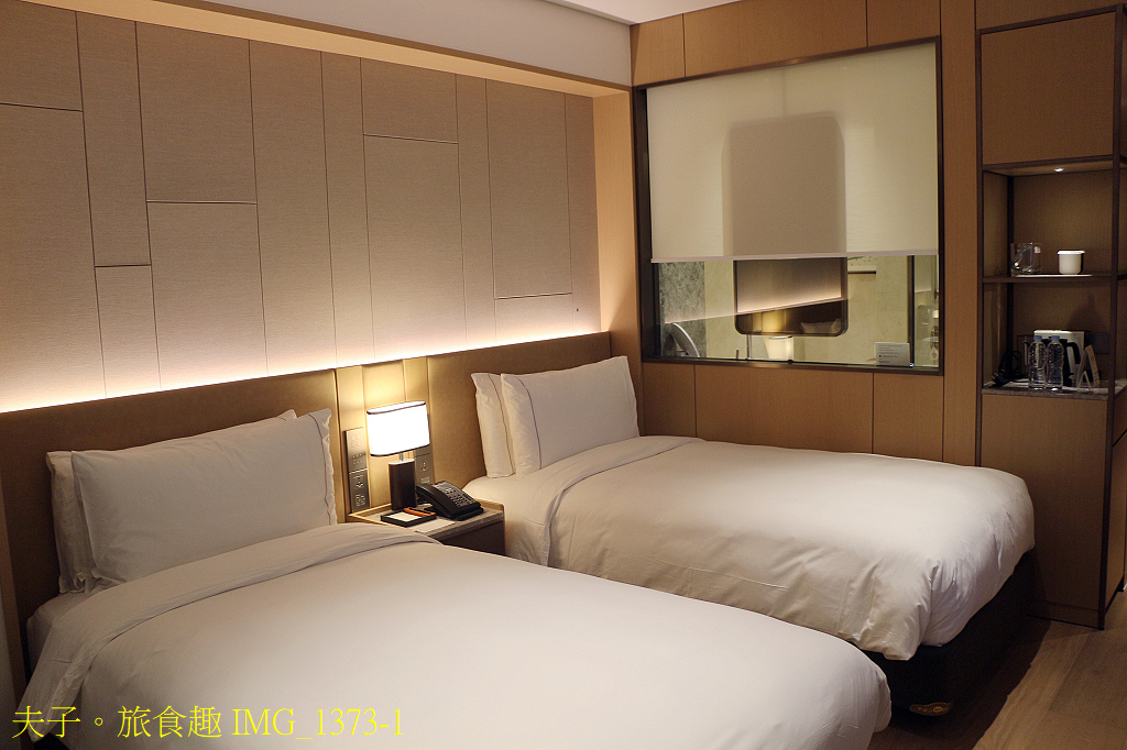 尊榮海景雙單人床客房 (Deluxe Double Room),現代風木質感簡約設計,大片玻璃採光室內寬敞明亮、溫馨舒適,居高臨下可俯瞰南港大橋、天馬隧道。