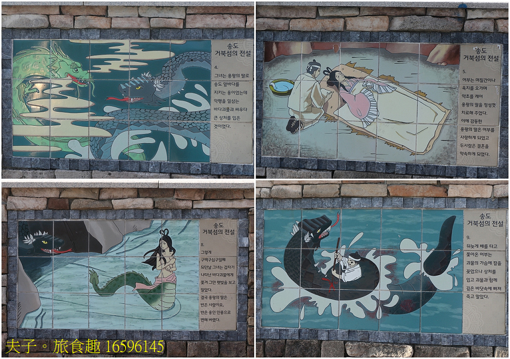 傳說:有一天年青的漁夫出海打魚遇上風浪,船隻風雨中隨波飄流到龜島,在此遇見龍宮公主驚為天人,並啟動愛戀之心。爾後漁夫多次前往龜島,尋訪公主只為再見一次面以解相思之苦。偶一次在龜島的石洞漁夫遇見被黑龍打傷的公主。漁夫將公主帶回家療傷,在漁夫的細心照料下,公主逐漸康復,彼此也因此滋生情愫愛上對方。但人神有不得戀愛的鐵律,公主的龍王父親更是極力反對,於是出了一道難題給公主,只要公主在黑洞修練 1000天,走出山洞後就能變成人類。公主果決的在黑洞中苦修,漁夫也默默在一旁守護。但不幸的是黑龍在知道這件事後,就在第1000天時進入黑洞攻擊公主,公主被迫迎戰並走出黑洞,違反規定的公主無法變身為人,但變成了人龍 (半人半龍)。更不幸的是漁夫在看見黑龍攻擊公主時也加入戰鬥,戰鬥中漁夫壯烈的與黑龍同歸於盡。龍宮公主因為心愛的人死了傷心不已,央求龍王讓漁夫復活,但人死無法復生,龍王只能將漁夫變成了一座石雕立於漁龜島,而公主因為真情不移,一直望著自己心愛的人最後也成了雕像。