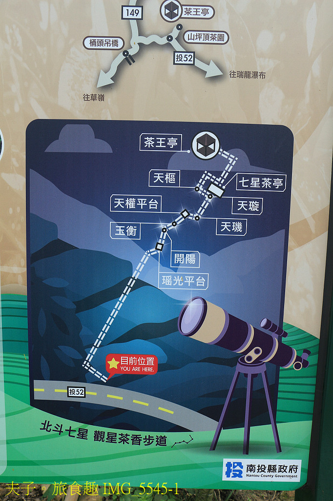 南投竹山山坪頂七星步道位於 [投52 (坪頂路)] 瑞龍瀑布園區前方 2.5公里處,結合步道與茶園風光以北斗七星圖案為概念規劃設計,石階小徑貫穿茶園,能與茶園做零距離的接觸,步道頂端的七星茶亭視線遼闊展望極佳,可俯瞰層層堆疊的茶園美景,也可預約旭美製茶廠的茶席體驗,是 2025年南投觀光品茶新亮點。