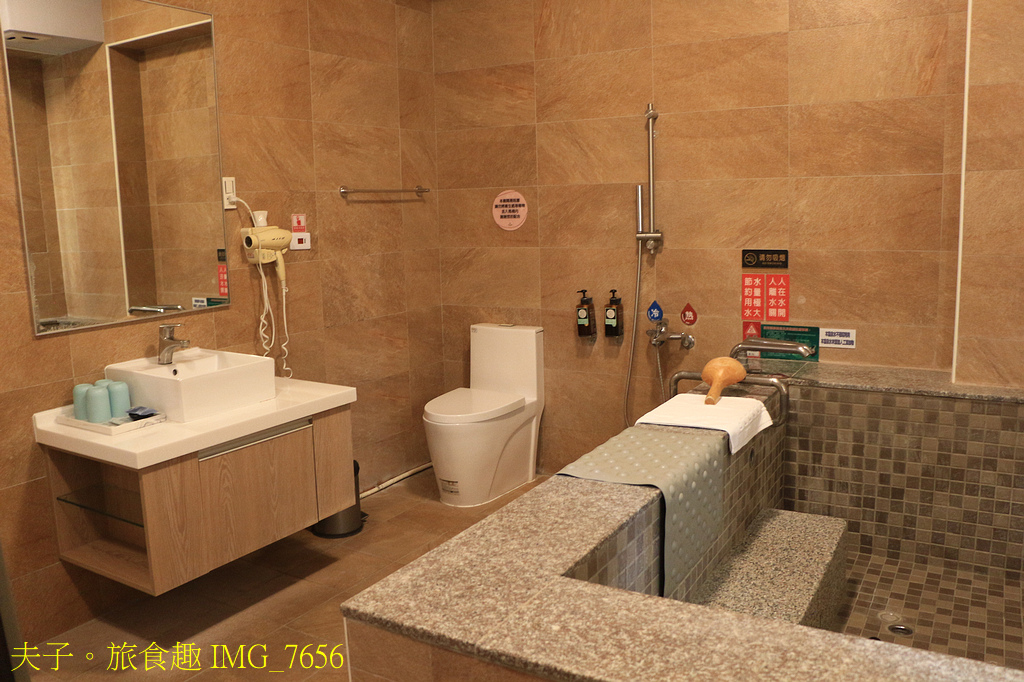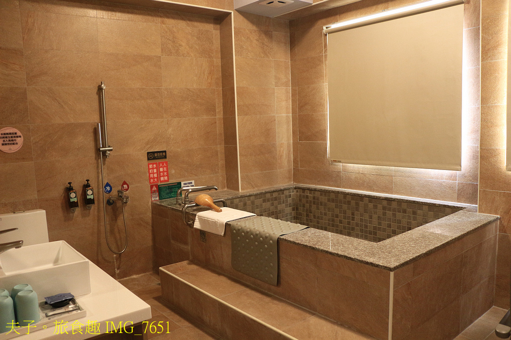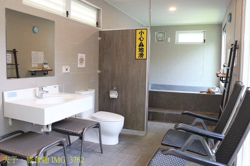 溫泉浴池旁設有淋浴花灑,配合政府政策,提供大瓶裝沐浴精與洗髮精,無主動提供一次性備品 (牙刷、牙膏、刮鬍刀)。