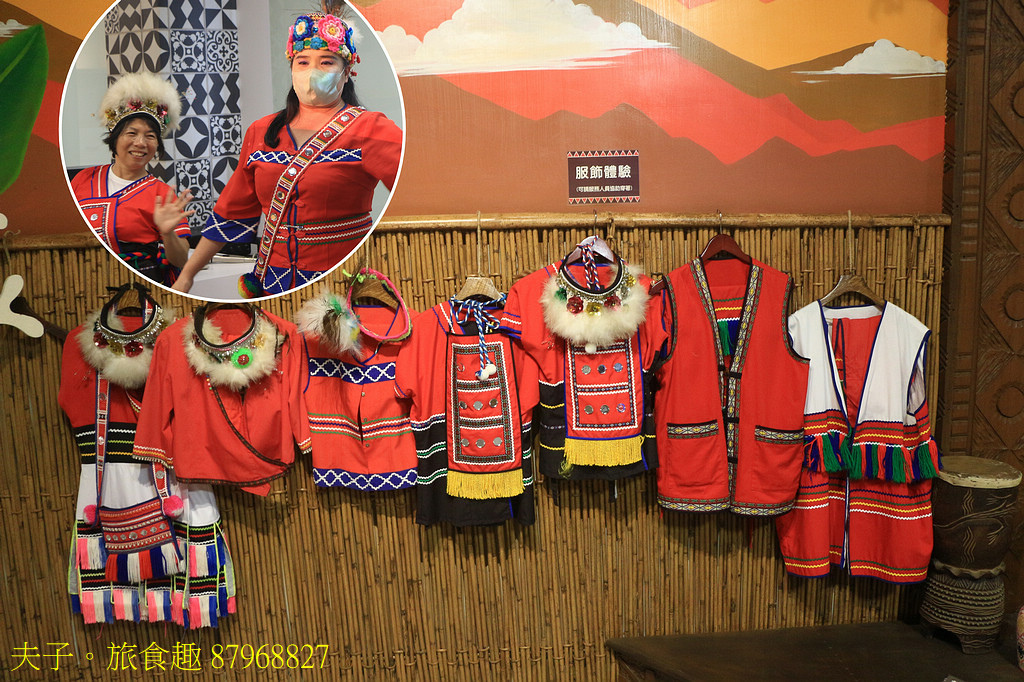 一棟阿美族單室前門式傳統家屋 (示範品),以木材為樑柱,竹為壁面,屋頂覆以茅草,屋內鋪有竹床、盆火,盆火上的吊架主要功能就是用來燻烤食物與保存食物。