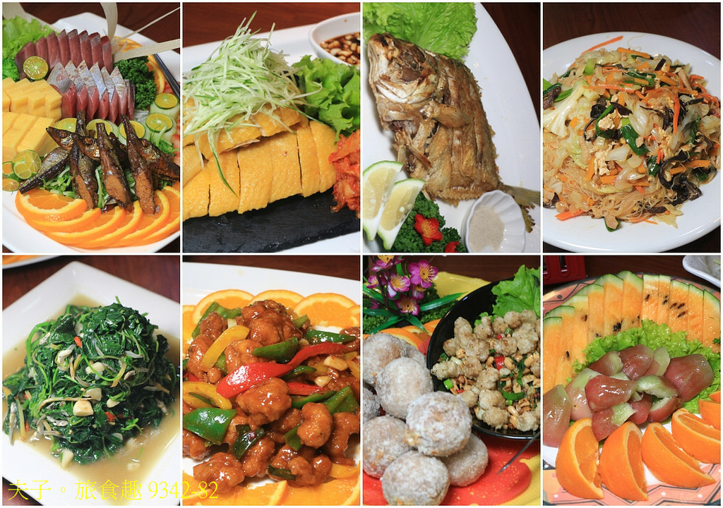 主廚菜單推薦:生魚片、玉米土雞、紅燒魚柳、鮮煎鯧魚、龍珠 (魷魚嘴) 拼芋園、炒莧菜、炒南瓜米粉、水果盤。