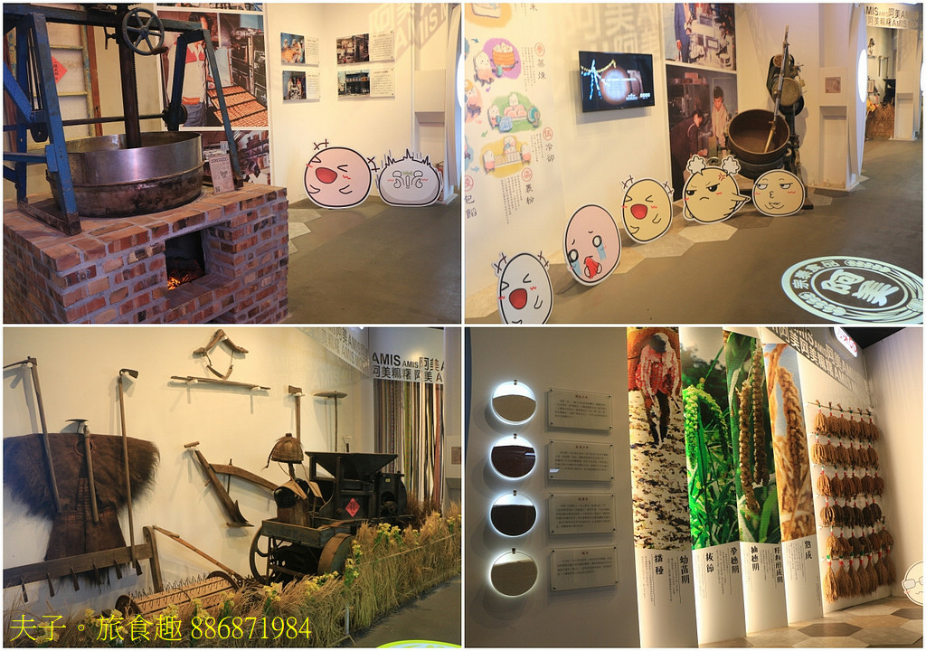 一條長廊左側介紹宗泰食品的企業精神、早期人工製作麻糬的工具、阿美族農耕器具及小米品種與種植生長過程。