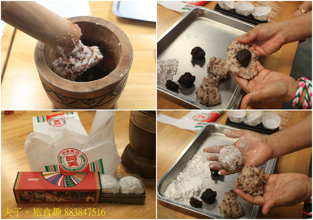 阿美麻糬「捶打麻糬體驗」DIY (需先電話預約),將蒸熟的熱紅粟米飯放入木臼中,用木杵上下用力捶打,透過搥擊讓紅粟米飯中的支鏈澱粉形成黏糯口感。打好的紅粟米飯概分三份。壓平包入紅豆內餡,搓圓沾粉防沾黏,好吃的手工麻糬完成。