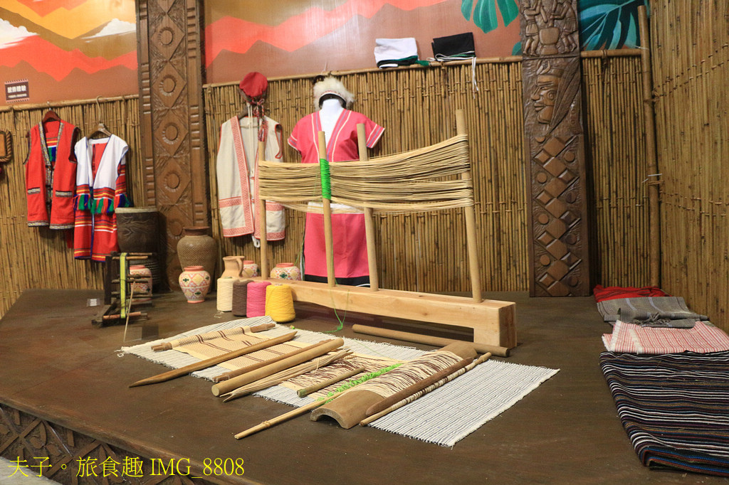 傳統家屋旁展示織布工具,一台理經架 (又稱整經架) 是調理經線的工具,婦女將苧麻線依照自己所要的圖案、顏色纏繞在理經架上,並以雙或單支柱決定紡布疋之長短,這是經線在上織機前的最後一道步驟。