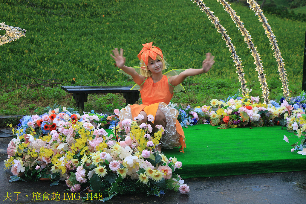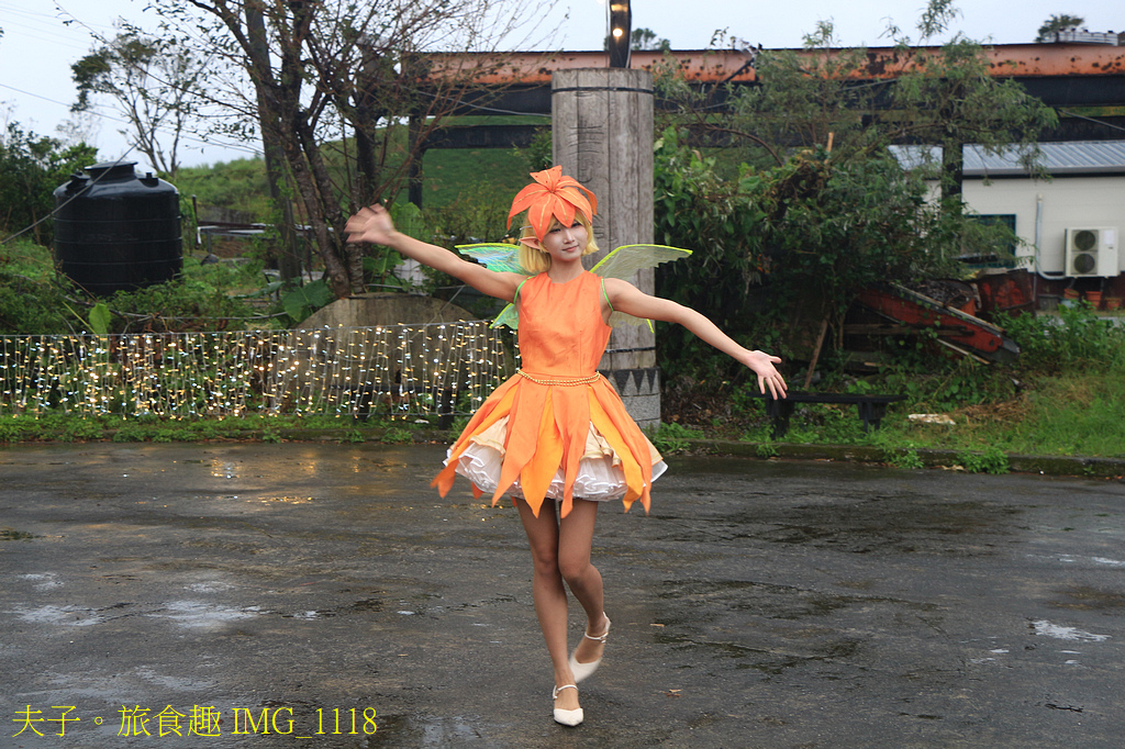 六十石山原創角色「花仙子朵拉 Dora」化身金針花的守護花神,傳遞山林的祝福、水資源永續理念與花開的療癒心意。(照片位置:春明農莊前的跳舞場)