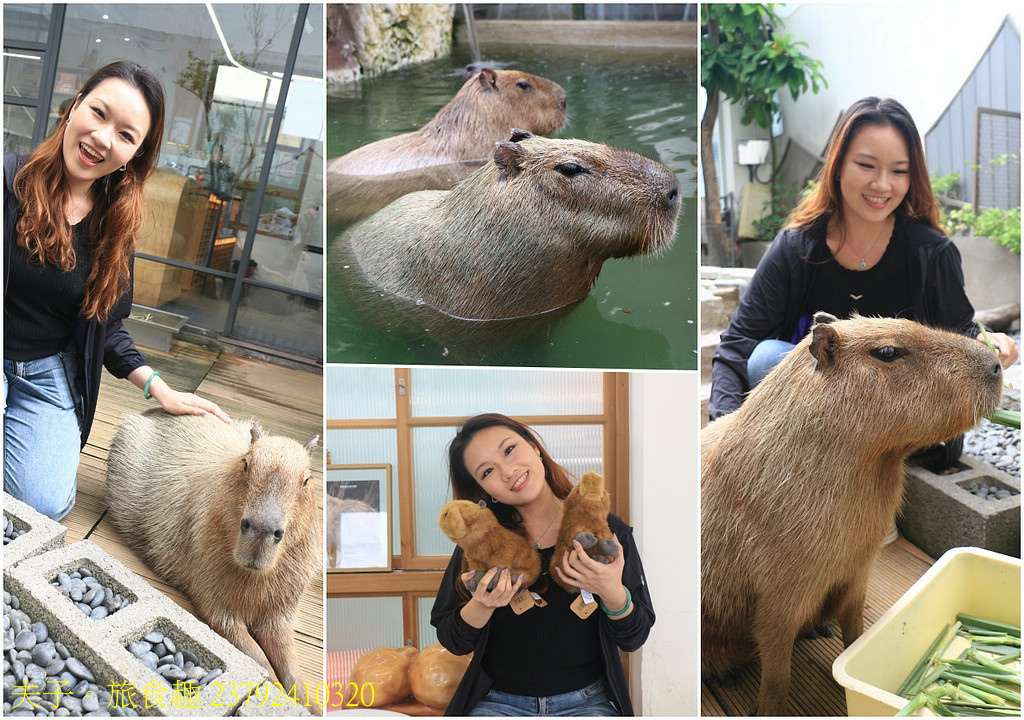 高腳椅臨窗而坐,邊吃甜點邊看水豚悠閒自在的泡在水池或在池邊吃牧草,超療癒的。