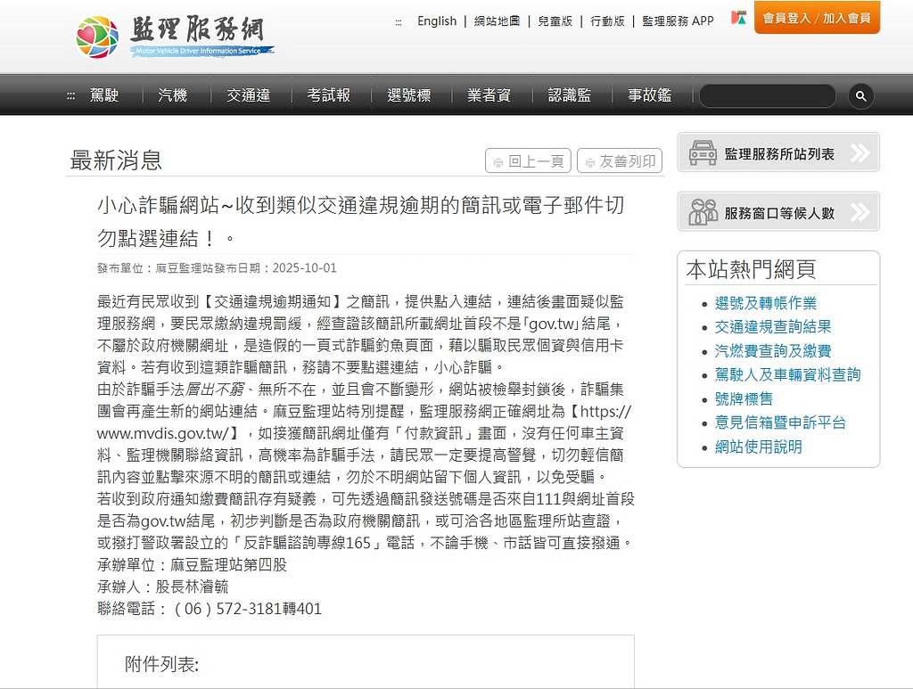 「交通違規逾期通知」簡訊詐騙最近應該很多,監理服務網的最新消息也在 2025/10/01 發佈「小心詐騙網站~收到類似交通違規逾期的簡訊或電子郵件切勿點選連結!」提醒民眾要小心。