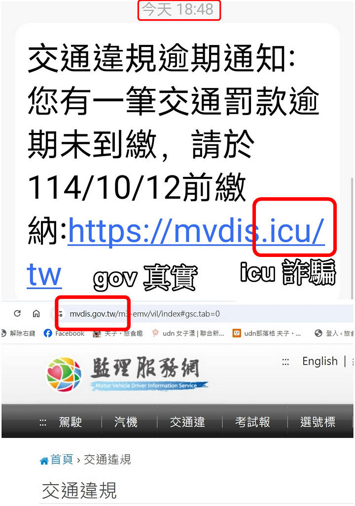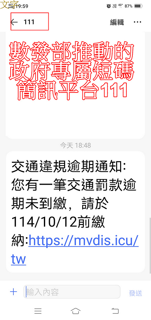 手機簡訊詐騙 ,今天 (2025/10/12) 18:48 手機突然出現一則來自 「111」的簡訊通知,內容是:「交通違規逾期通知:你有一筆交通罰款逾期未到繳,請於114/10/12前繳納:https://mvdis.icu/tw」。