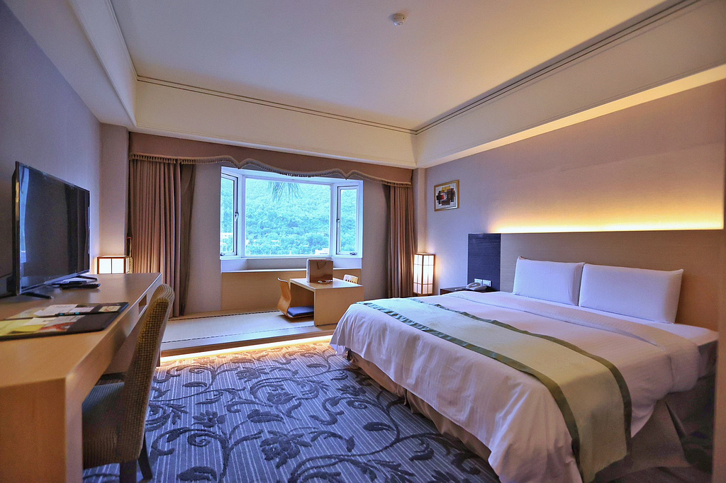 豪華景觀雙人房,大型三面窗鏡面玻璃,窗景引入山景,陽光灑落滿室綠意。