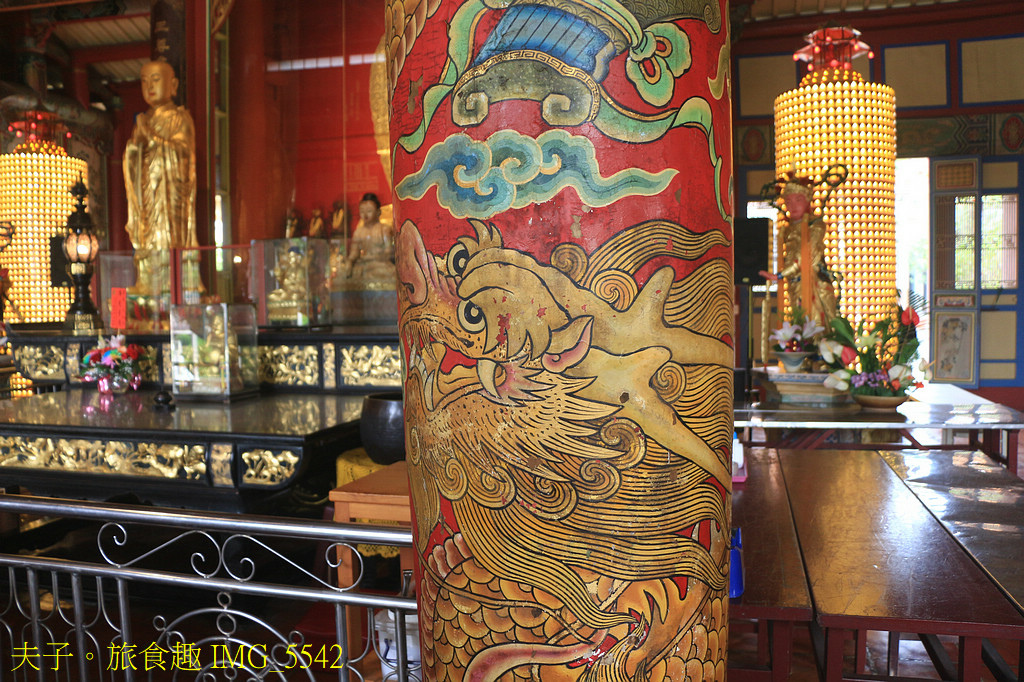 大雄寶殿殿內有六根彩繪的蟠龍柱,出自學甲彩繪名師李漢卿之手,採「披麻捉灰」的方式完成,超過三公尺的柱子,盤踞著一隻或二隻不等的龍,下有海浪、中有祥雲,兼有仙鶴、麒麟、鳳凰等共同悠遊。