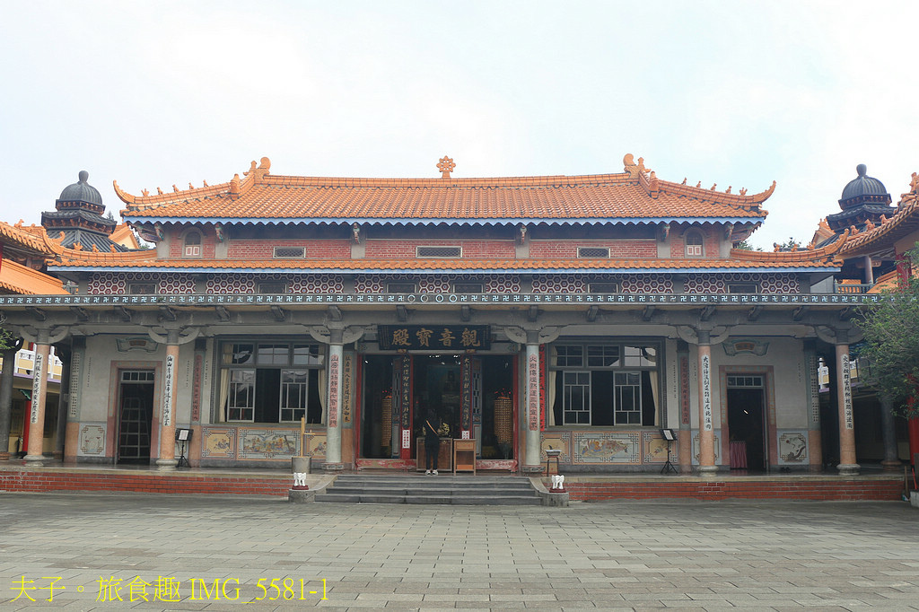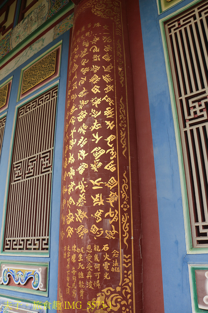 第二進觀音寶殿,建築牆面裝飾有磨石子技法製作的佛經故事、花鳥風景。簷柱上的書法,包含了四種不同的書法字體,也都是以磨石子的技法鑄成。