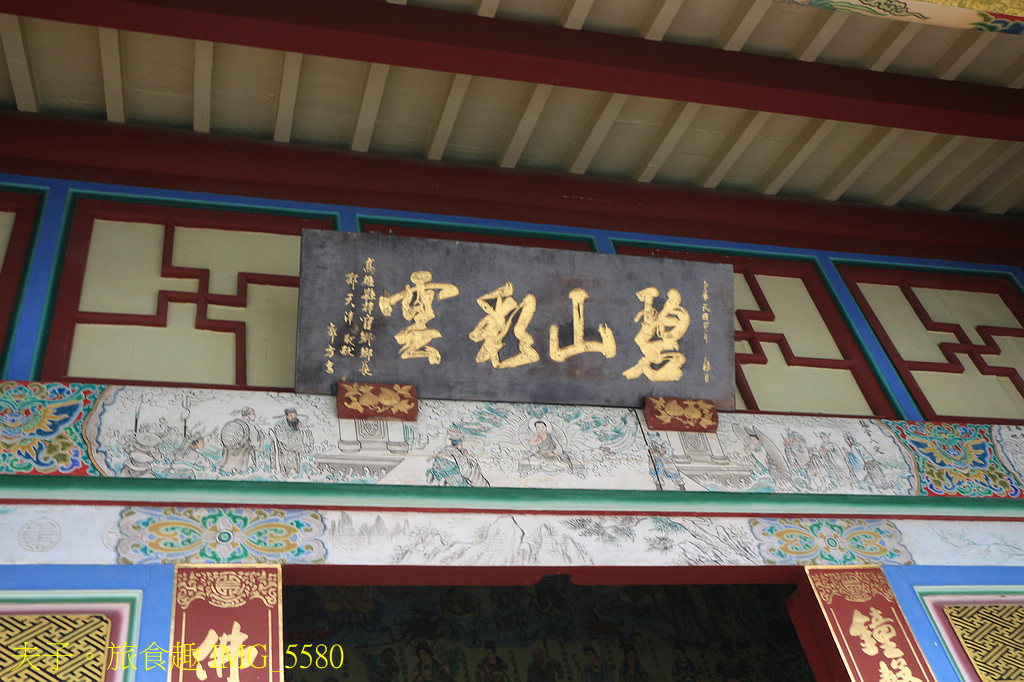 走出大雄寶殿後,一定要回頭看看殿後,匾額「碧山彩雲」的下方的樑枋畫的是「龍宮入定」的度化故事,講的是釋迦牟尼佛接受「迦羅龍王」及「目真鄰陀龍王」的請求,來到龍王的宮殿入定七天,期間風雨不停天氣寒冷,龍王為了保護佛陀不受風寒侵害,以身體環繞佛陀進行保護,畫面左右的蝦兵蟹將也分立兩側伺候守護。 由於龍王在佛陀入定的期間的保護,展現了皈依佛法的誠心,龍王也因此成功接受度化。