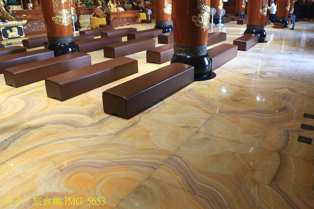 進入大雄寶殿可要記得抬頭看看通樑上彩繪大師李漢卿的擂金畫 (照片) 與牆面生動精美的壁畫。