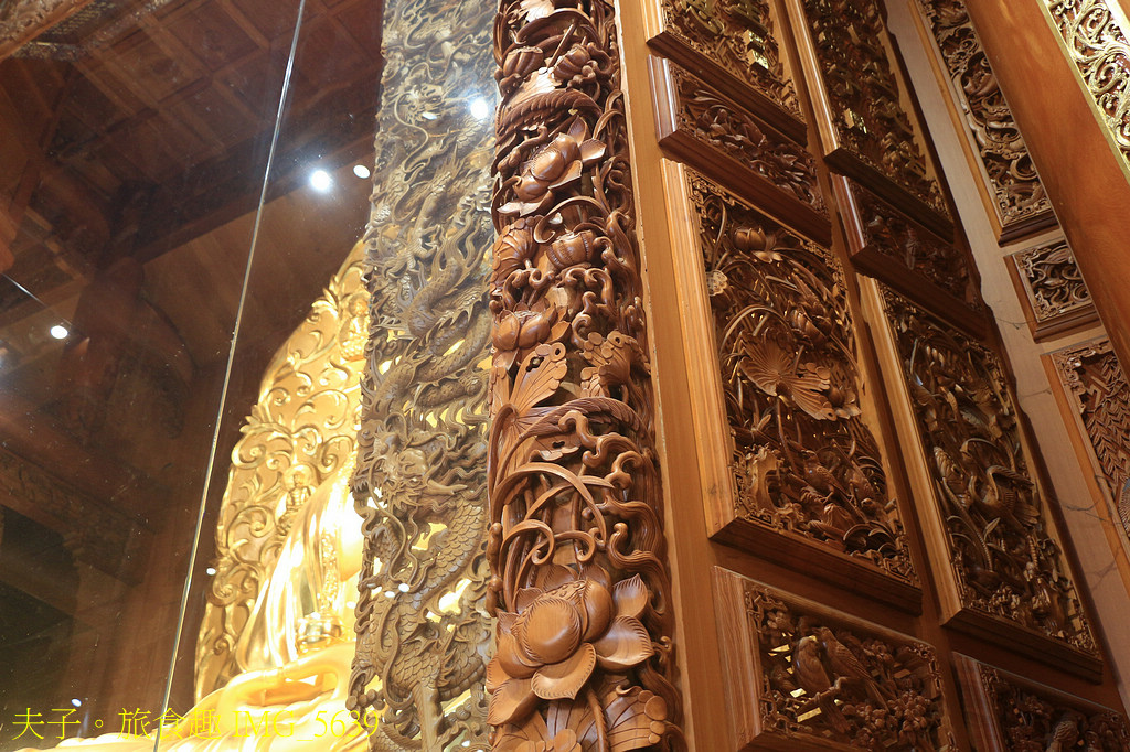 屋簷抬樑、斗栱,層層疊疊的檜木雕畫,空氣中充滿檜木香氣,值得細細瀏覽木藝雕刻之美。
