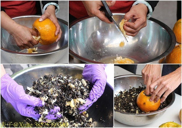 3. 倒入山茶茶葉後充分混合,需等待山茶茶葉完全吸收果汁後,回填虎頭柑。