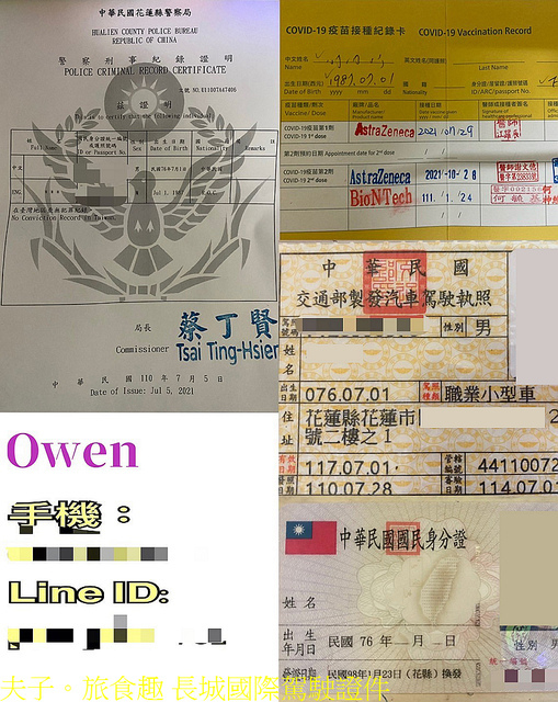 膺應 COVID-19 疫情規定,花蓮長城國際運旅出車前,除了提供司機的身分證、駕駛執照照片,供我們檢核外,也提供警察局核發的良民證明及三劑疫苗施打小黃卡照片,讓我們安心的把旅行的交通安全交付給司機。