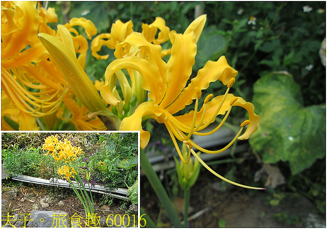 金花石蒜,花期在每年八月到十一月之間,金花石蒜是一種奇特的植物,於每年秋天由鱗莖先長出花梗再開花,等到花朵凋謝後,才會開始長出葉片,也就是說,金花石蒜只有在冬天才會長出葉片,可是到了隔年的四月以後,葉片末端就會出現枯黃老化的現象,且進入休眠期,直到八、九月,又再抽芽開花。當它開花時,花梗直接由地面竄出,且沒有任何葉片,因而稱之為「忽地笑」、「樂蔥」;又因花朵開放時,花瓣是波浪狀向外翻捲,類似中國古代龍的爪子,故俗稱為「龍爪花」。