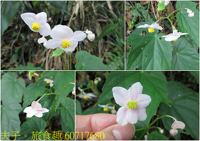 水鴨腳秋海棠,花為雌雄同株異花,雄花花被 (花萼和花冠的總稱) 四瓣,花苞類似一枚蚌殼 (照片:上排),雌花五瓣,在蚌殼花苞下方有一三角形的子房,非常容易分辨 (照片:下排)。