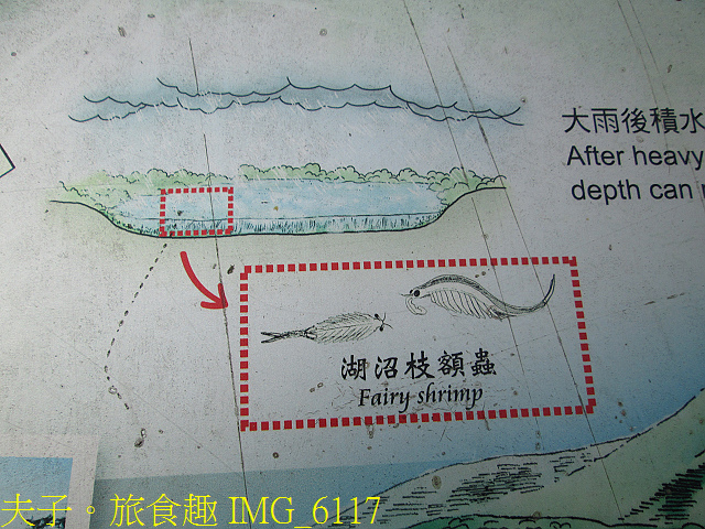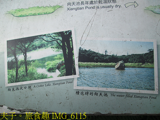 向天池,雨季大雨過後水深可達 5公尺,積水會在幾天內迅速滲入地底,比對解說牌上向天池的雨季照片,可以想見雨後的向天池。