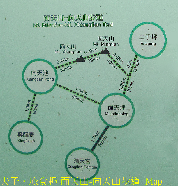 遠處雷聲隆隆,天邊開始聚集黑雲,怕是要下雨了,雖然面天山近在眼前,前方只剩 400公尺的陡坡石階路就可登頂,地圖上寫著由面天山回到向天坪的路程也只有 0.8 (0.6+0.2) 公里,路程總共 1.2公里,但第一來沒走過,不明路況也不知是否有分叉路,實在沒有把握是否能走正確的路,且能預估時間。