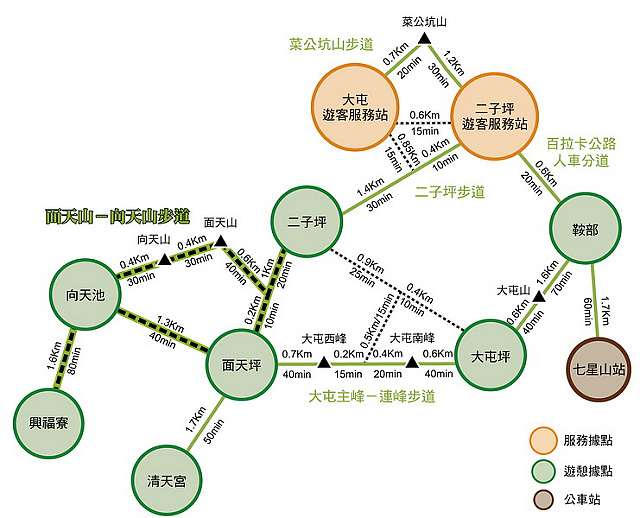 如果是搭公車前來,結合二子坪步道與面天山 - 向天山步道,可以在陽明山公車總站,轉乘108遊園公車到達二子坪遊客服務站,走親子級的二子坪步道 (1.8公里),順遊二子坪生態公園,再前往面天山 (1.6公里),最後循向天山、向天池、面天坪路線,到達新北投清天宮 (3.8公里),坐小6公車回捷運北投站或北投站,亦可反向。