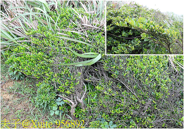 濱柃木,本名叫凹葉柃木,俗稱馬祖紫檀,常綠性灌木,性耐風、耐鹽,是島上的優勢植物。因為經過島上強勁的東北季風洗禮,自然成形的樹姿伸展優美的風切樹,濱柃木開花期,黃白色的小花,雖然玲瓏可愛,但是散發出來的氣味卻是有點臭臭的。