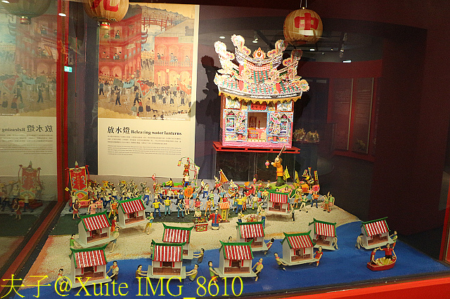 當晚十一時 (一五日子時) 的放水燈,以字姓為核心的宗親會,會將印有宗族姓氏的水燈,施放在望海巷海濱,招引海上的孤魂,前來享受人間的供奉,民間相信水燈燃燒得越遠,字姓的運勢就越旺。(照片:中元祭祀文物館放水燈解說模型)