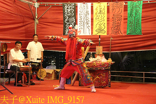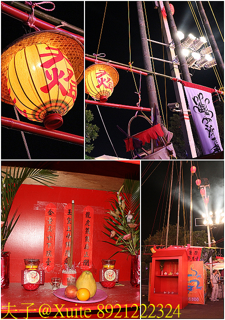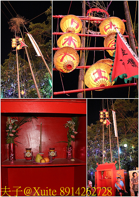 注:燈篙,陽間一尺,陰間三尺 主普依財力設立燈篙長度,用以「上照九天、下照九幽」指引好兄弟前來享用祭品。燈篙概分招神之陽竿與招鬼之陰竿分列主普壇兩側,陽竿立於左側白天升起,分別懸掛招請天神的「天燈」、「天旗」以及表達祈願謝恩之意的「天布」、「天錢」等物。