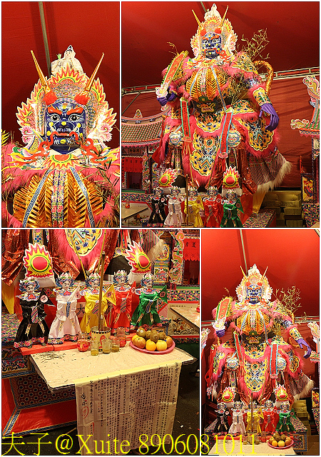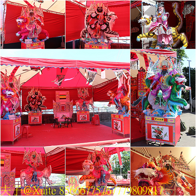 四季平安棧 (照片:上排) 與以雞鴨魚肉等牲醴製成的看牲 (照片:下排)。