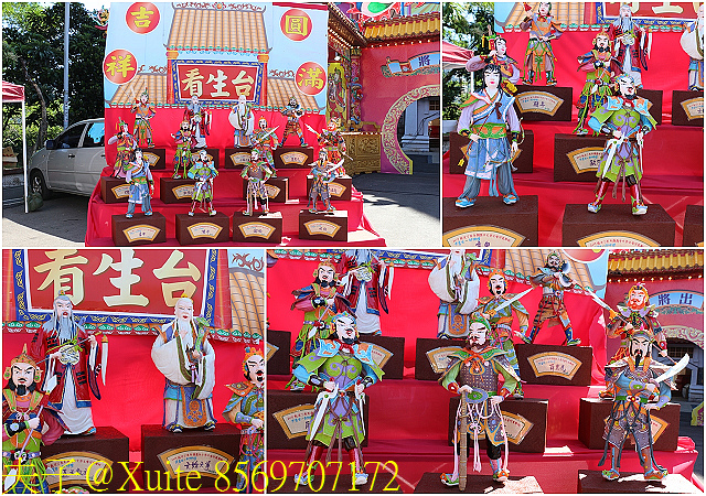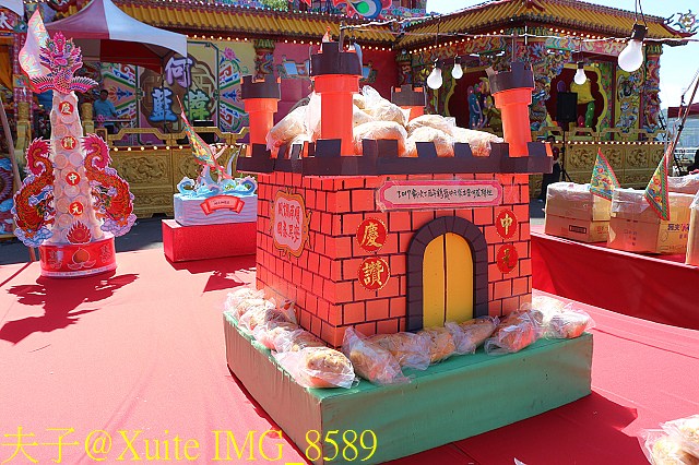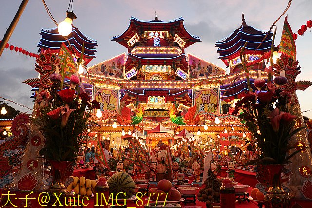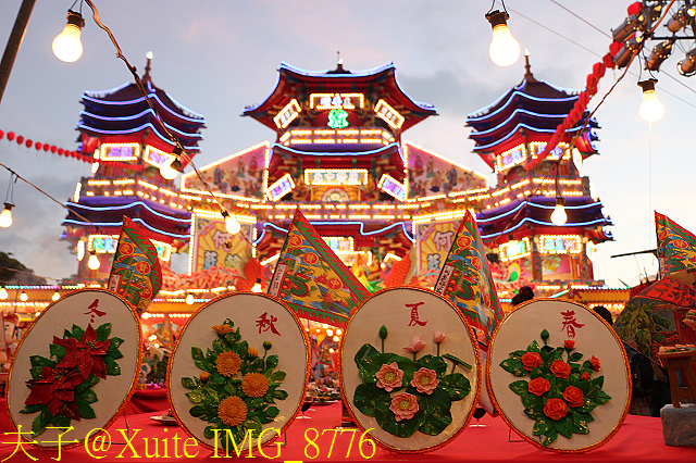 供桌最後方,放置形似蓮花的摩珂棧意為老大公再生 (照片:右上),放置裂桃 (註) 棧為過壽的老大公祝壽 (照片:左上),並設置一座小看生。