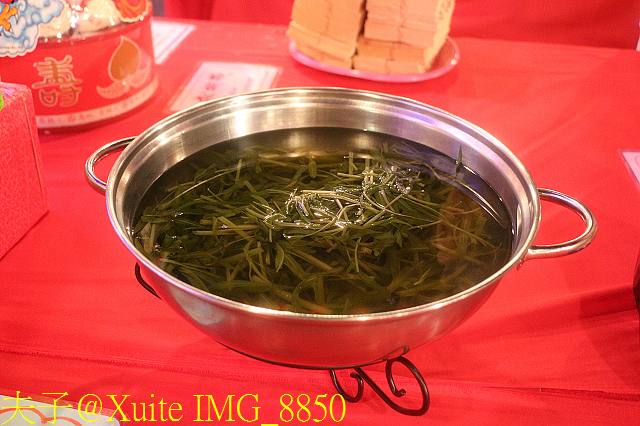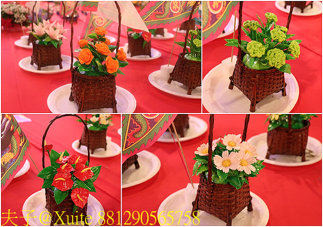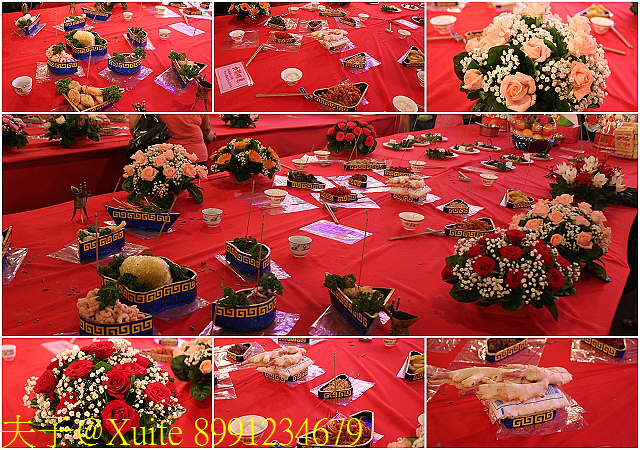 九龍桌,帝王請貴賓之佳餚,豪華的九龍桌特別裝飾花朵,象徵在御花園用餐,並以薑象徵山珍、鹽巴象徵海味,意取山珍海味。
