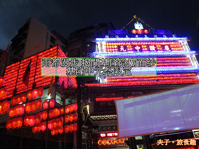 這段期間,基隆街道都會掛一整排書寫著「慶讚中元」的普渡公燈,為路過的孤魂野鬼照亮路。