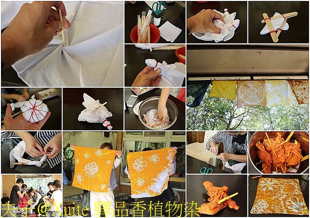 厭倦市面上制式DIY課程,筆者(夫子) 推薦不一樣的植物染DIY,驛品香農園用薑黃熱染屬於自己風格的手作植物染方巾。植物染布是人類古老的智慧,成份天然、安全、不會產生有毒廢液,染出來的布料顏色柔和層次細緻,運用技巧更能展現創意。有別於屬於冷染的藍染,事先需要用大青 (馬藍),透過致靛、建藍、養藍等過程製作藍靛染液,薑黃熱染除了要加熱外,在染布的過程中,顯得更容易學習與自行操作。布料透過抓皺 (產生雲彩)、折疊 (產生多邊形)、扇子折 (產生平行漸層)、綁棒子筷子 (產生線條)、筷子捲 (產生花朵) 等技巧,在加上綁橡皮筋或棉線的鬆緊,染出獨一無二的個人創意作品。