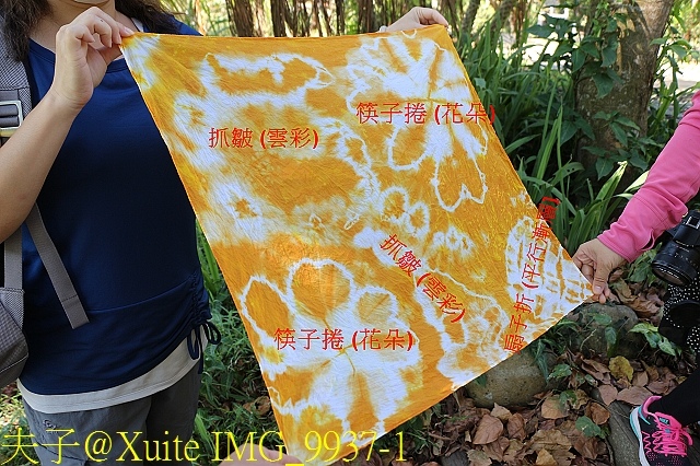 筆者(夫子) 運用抓皺 (產生雲彩)、扇子折 (產生平行漸層)、及筷子捲 (產生花朵) 三種花紋產生技巧,再加上綁橡皮筋的處理,製作成的個人創意作品。