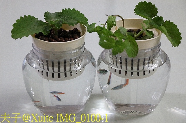 1. 將含有豐富養份 (硝化鹽) 的水耕水倒入魚缸1/3滿,放入日光魚。